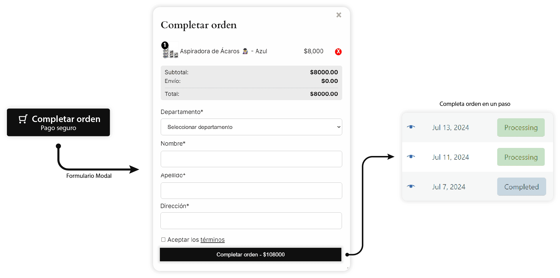 Permite a tus clientes finalizar la compra directamente desde una ventana modal.